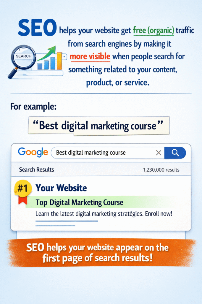If someone searches for “best digital marketing course”, SEO helps your website appear on the first page of search results.